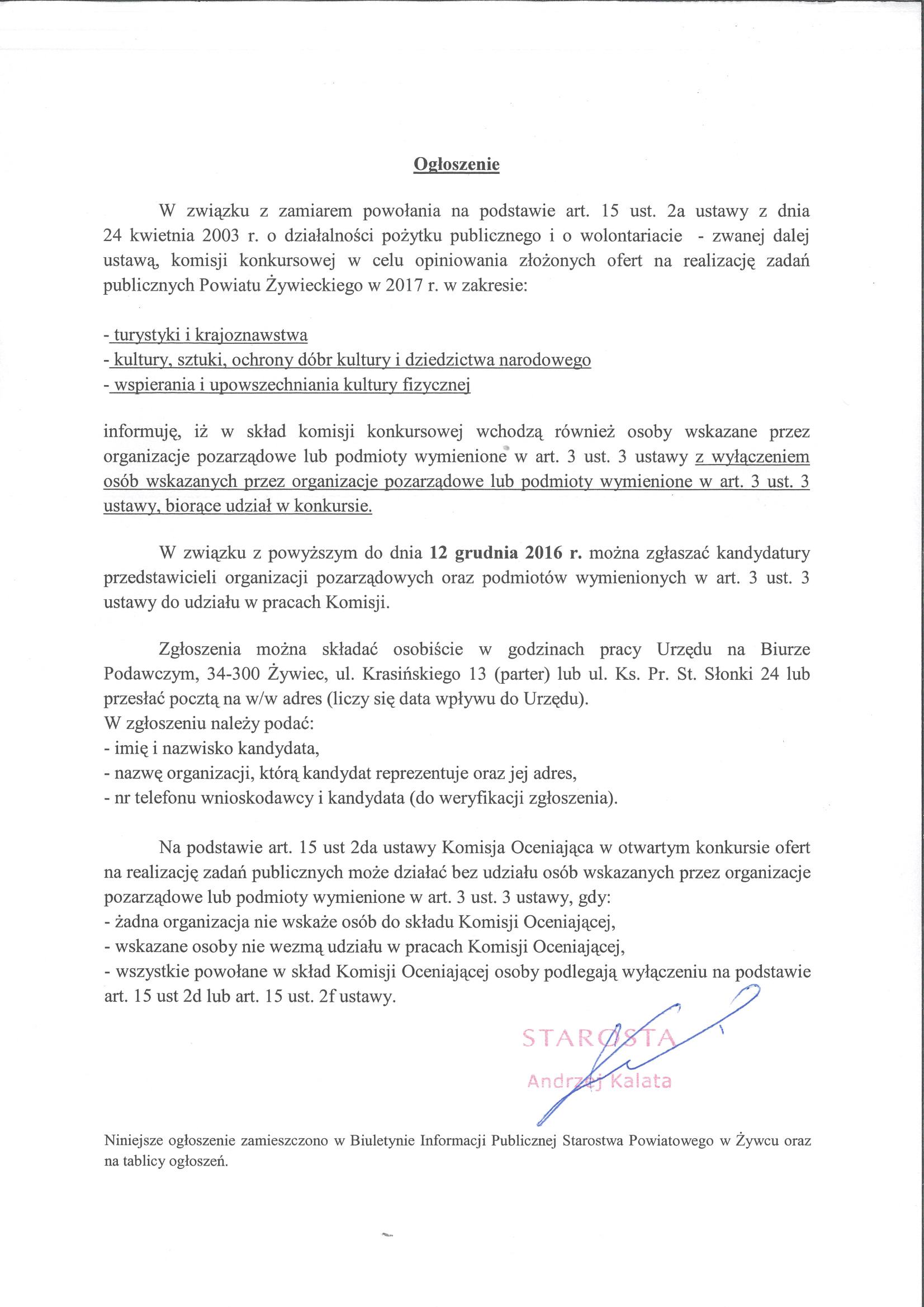 Ogłoszenie W związku z zamiarem powołania na podstawie art. 15 ust. 2a ustawy z dnia 24 kwietnia 2003 r. o działalności pożytku publicznego i o wolontariacie - zwanej dalej ustawą, komisji konkursowej w celu opiniowania złożonych ofert na realizację zadań publicznych Powiatu Żywieckiego w 2017 r.